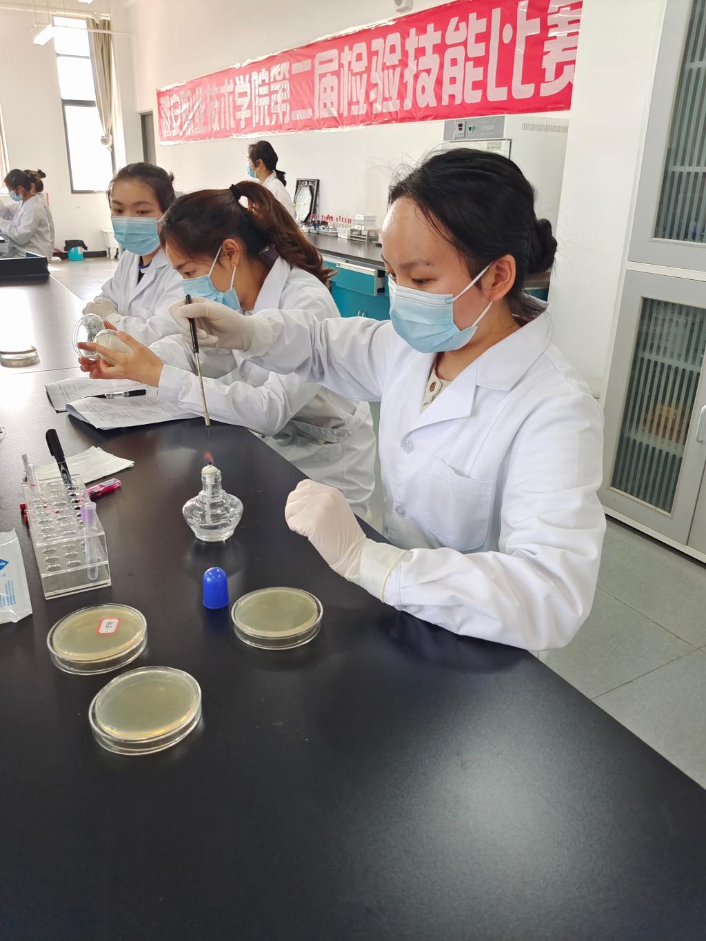 本次竞赛内容为形态学检验、微生物检验、血涂片制备、防护服穿脱四个比赛项目。赛前教研室老师们认真讨论完善比赛内容与组织形式,教研室实验老师积极协助进行实验物品准备。同学们参赛热情很高,20级医学检验技术专业109名同学有54名同学报名参赛,经过初赛选拔,有32名同学进入决赛。决赛于4月26日在经开区校区举行。经过决赛角逐,20级医学检验技术2班的蒲香竹、张丽萍、梁玖梅三名同学获得一等奖。