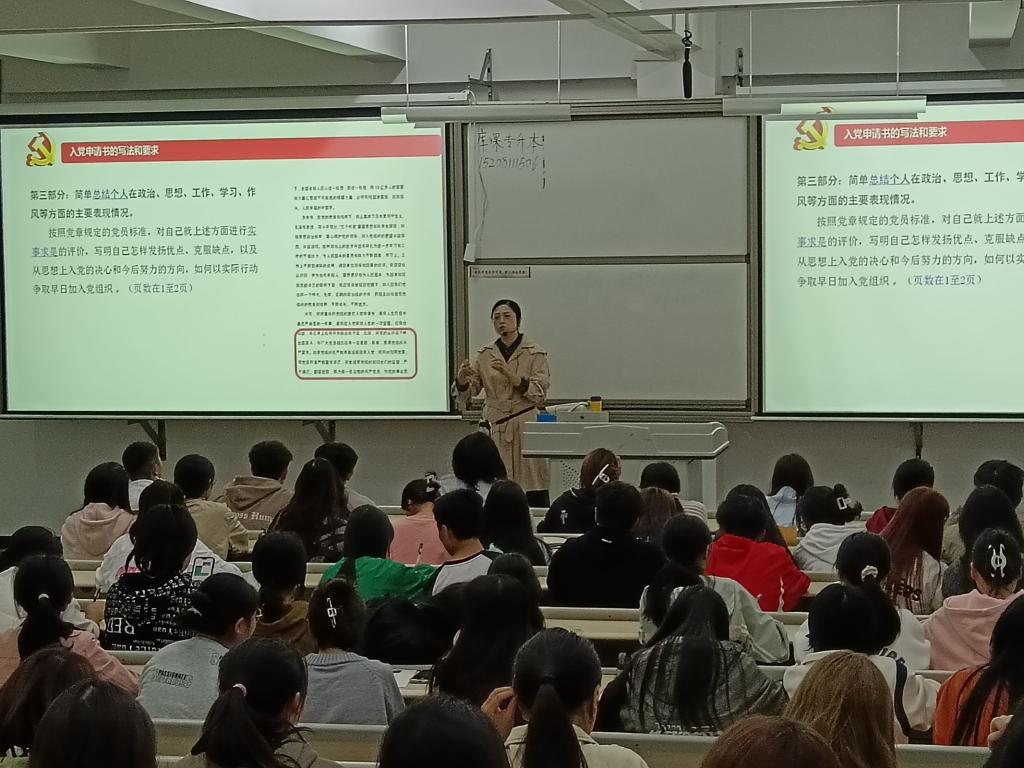 2023年10月10日下午,公司第三党支部组织有入党意愿的2023级新生共87人,在经开校区1104教室开展员工素质拓展讲座《党的组织发展——入党的基本程序》,讲座由公司第三党支部书记芦珂主讲,由公司第三党支部员工党建工作站员工干部负责组织维持现场秩序。