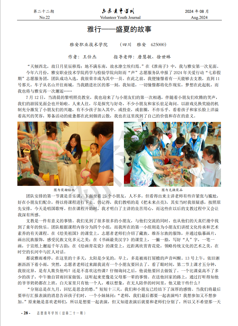 2024年7月,王仕杰同志作为向阳而“声”实践团队长,带领团队成功遴选上由团中央青年志愿者行动指导中心、中国青年志愿者协会秘书处组织的关爱行动“七彩假期”志愿服务团活动,并在雨城区大兴顺路社区开展了为期13天的志愿服务活动。团队在积极心理学视域下,借助声音表达的媒介,从心声、心生、心灵、心光四个角度出发,因材施教,寓教于乐,帮助增强儿童自信心,塑造积极向上的心理品质。