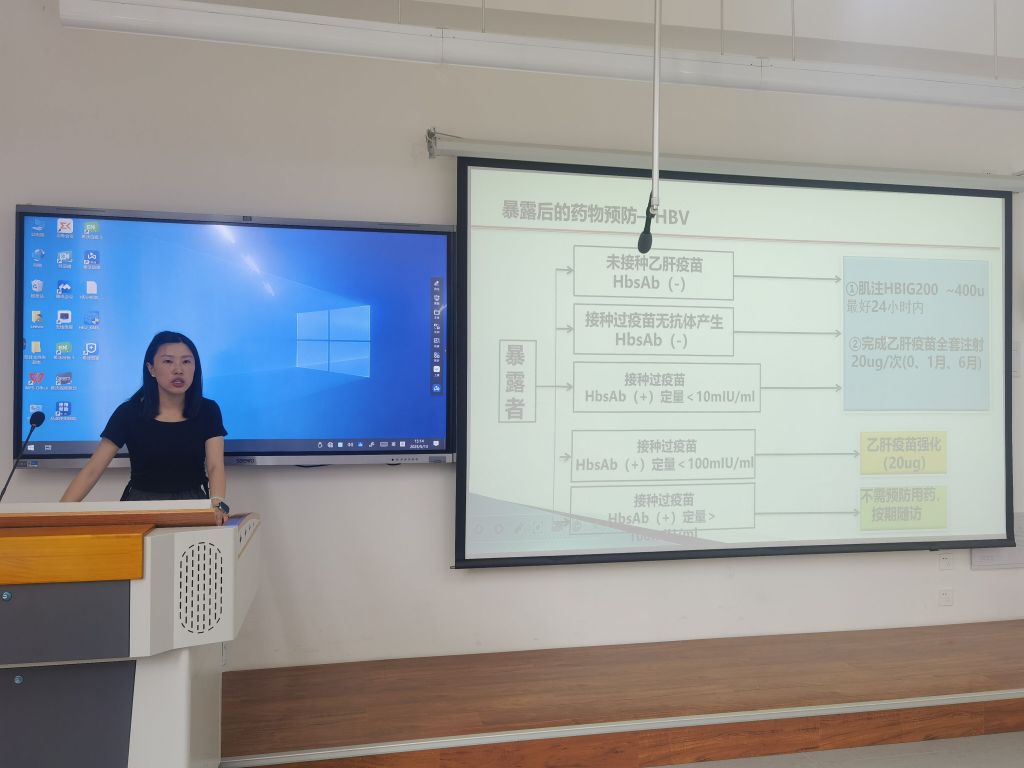 讲座伊始,马雨茹科长以实际案例为切入点,深入浅出地介绍了血源性职业暴露的概念、常见类型及潜在危害,让在场师生深刻认识到做好防范工作的重要性与紧迫性。随后,科长详细讲解了职业暴露危险因素及防范策略、职业暴露处置方案,每一个环节都进行了细致的阐述,确保师生们能够对职业暴露有更为清晰的认识,最后用事后弥补不如始终控制,事中控制不如事前预防进行简要总结。