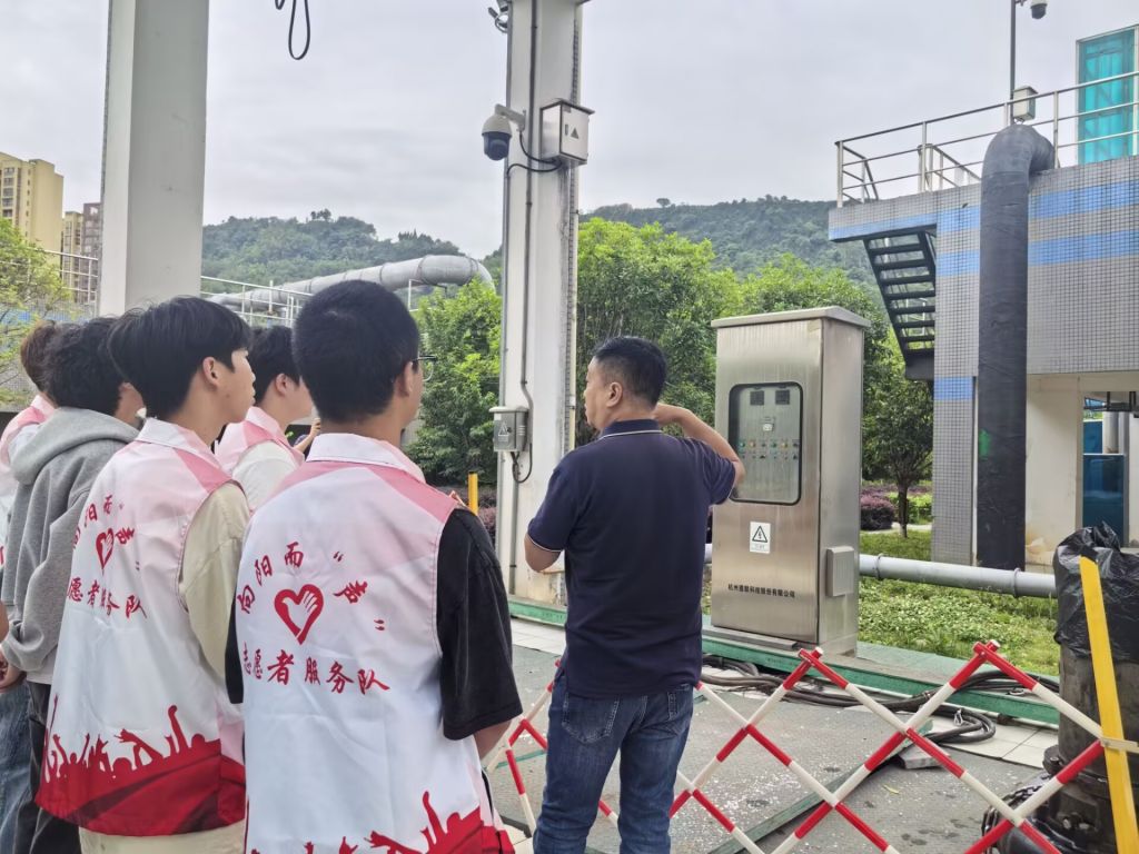 活动当天,污水处理厂冯厂长亲临现场,为志愿者们进行讲解。首先,志愿者们一同观看了天瑞水务公司的宣传片,了解其在污水处理领域的发展历程与成就。紧接着,冯厂长为志愿者们介绍了雅安市污水处理的操作程序,让大家对整个污水处理体系有了宏观的概念。随后,志愿者分组实地参观污水处理厂,在工作人员解说引导下,深入了解三级处理程序,从污水进厂沉淀,到生物反应池污染物分解,再到深度净化,环节引人入胜。参观过程中,志愿者踊跃提问,工作人员耐心解答,助其加深对污水处理原理、技术及重要性的理解。