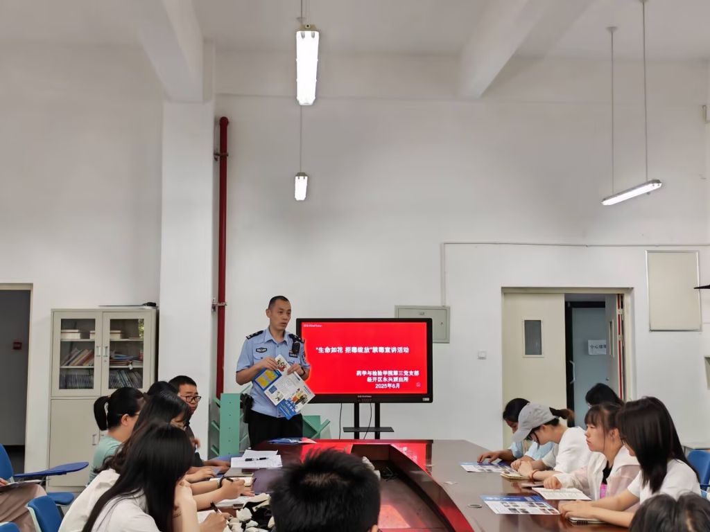 2025年6月26日是第38个国际禁毒日,为进一步增强支部教师及入党积极分子的禁毒意识,提高识毒、防毒、拒毒能力,营造全民禁毒的良好氛围,上午10:30,公司第三党支部邀请经开区永兴派出所民警走进支部,在食品药品生产实训楼203开展了主题为 “生命如花,拒毒绽放” 的禁毒宣讲活动,支部教师、入党积极分子和各班员工代表共计56人参与此次活动。