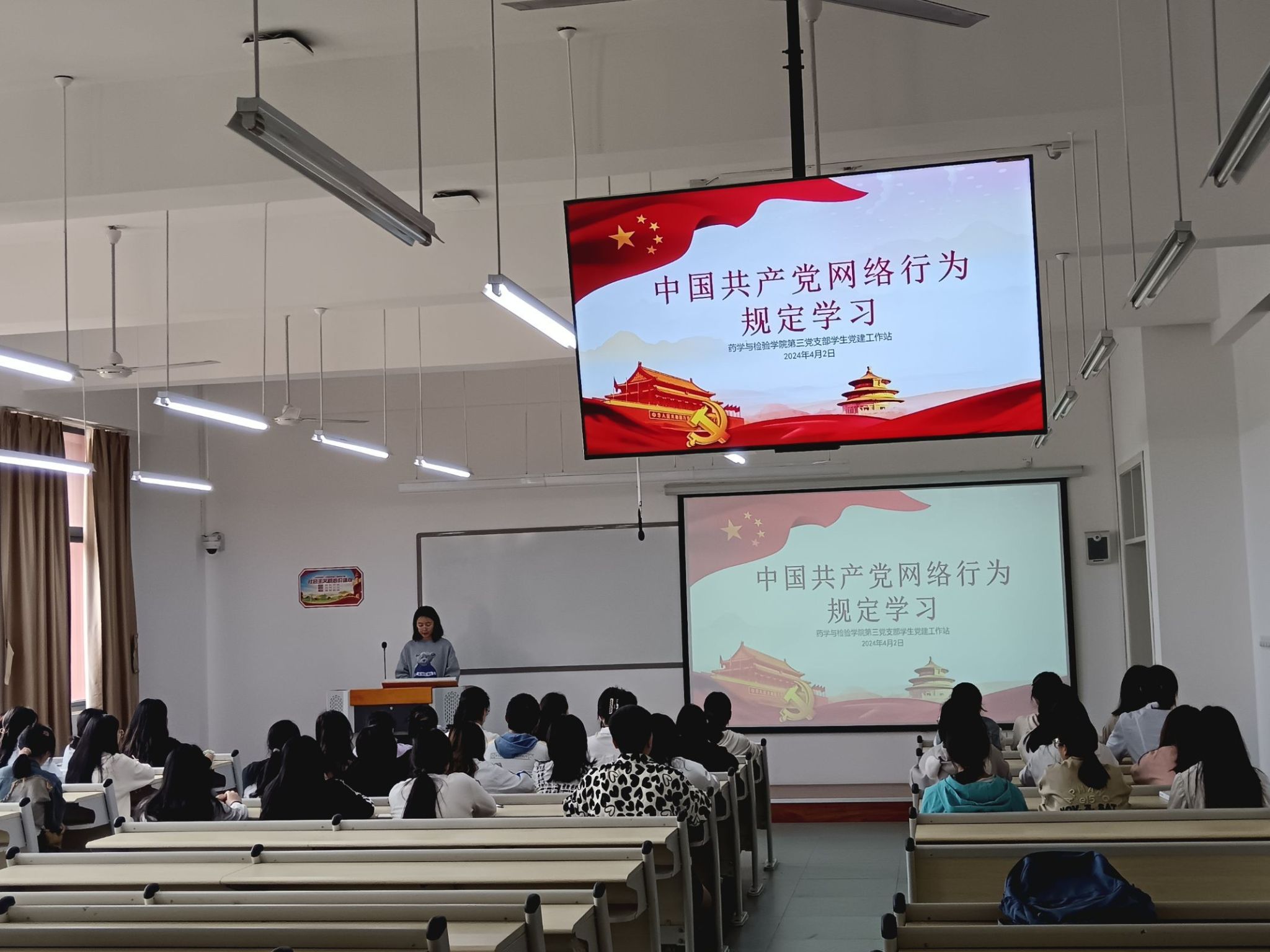 2024年4月2日中午,第三党支部组织入党积极分子47人在经开区校区5304教室开展集中学习活动;学习活动由第三党支部员工党建工作站理论宣讲员王钰婧领学,学习内容有国家安全教育、党员网络行为规定和新修订的《中国共产党纪律处分条例》。