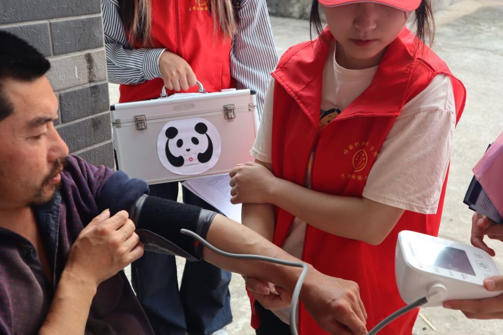 团队成员共分为三个组,其中义诊组的同学在林浩老师带领下到彝族乡便民服务中心外支起桌椅板凳,为当地居民提供血压检测服务,填写健康问卷调查,让老人了解自己的血压健康状况,同时针对家庭常备药做解答和科普。