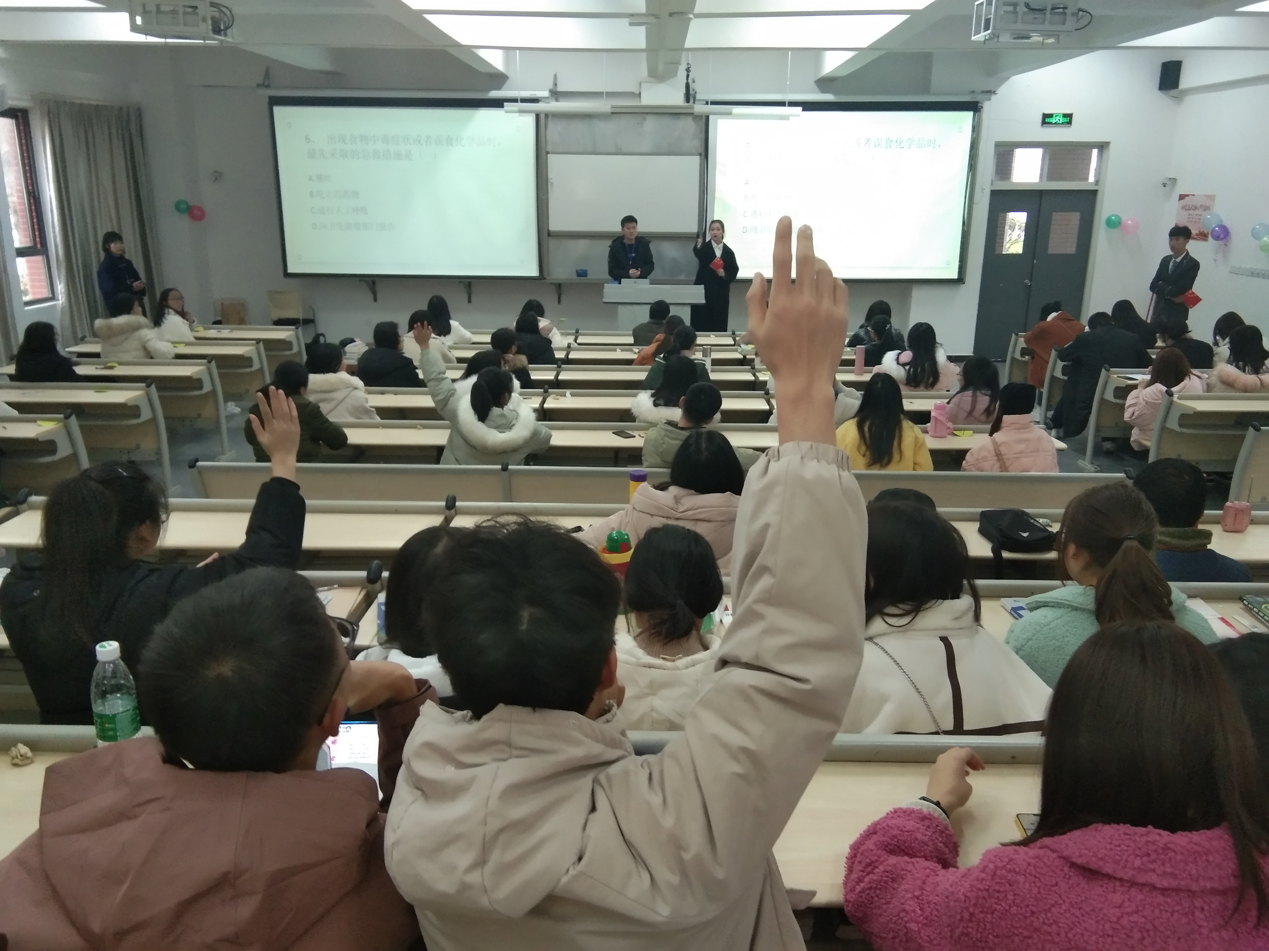12月20日中午12:40,“第六届药理知识竞赛”决赛在1204教室举行,云顶国际8588yd团总支副书记陈静老师、化学与分析教研室主任林浩、药学和中药教研室老师李飞及参赛队员的亲友团等到场观摩了比赛。