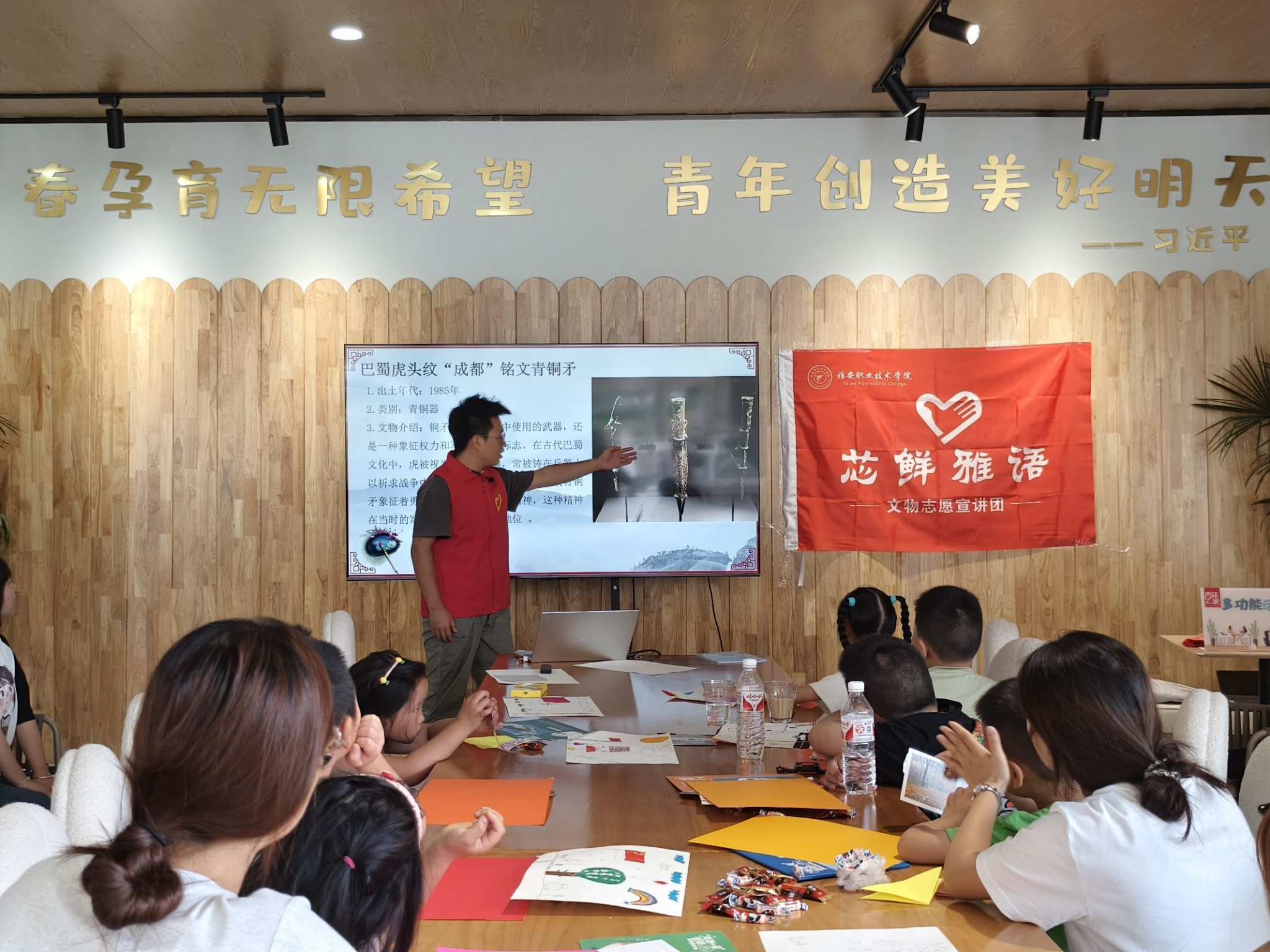 活动以雅安荥经县博物馆文物为主题展开,首先简单介绍了荥经县博物馆,让大家对荥经县以及巴蜀文化有了初步的了解,而后进行了对具体文物的介绍,以巴蜀月牙形“心”纹青铜章、巴蜀虎头纹“成都”铭文青铜矛、巴蜀镶嵌绿松石勾连凤鸟纹四钮青铜盖罍、巴蜀鸟鱼纹青铜剑为代表的具有巴蜀文化时代特色的青铜器展开介绍,同时也介绍了巴蜀文化的传承,让大家更多的了解到了更多关于青铜器的知识以及它背后的价值,让大家感受青铜器时期的工艺的精湛和智慧。活动过程中,宣讲员一边讲解一边与大家进行互动交流,通过这种学习方式让大家更深刻的认识和学习到巴蜀文化是中华文化的一部分。