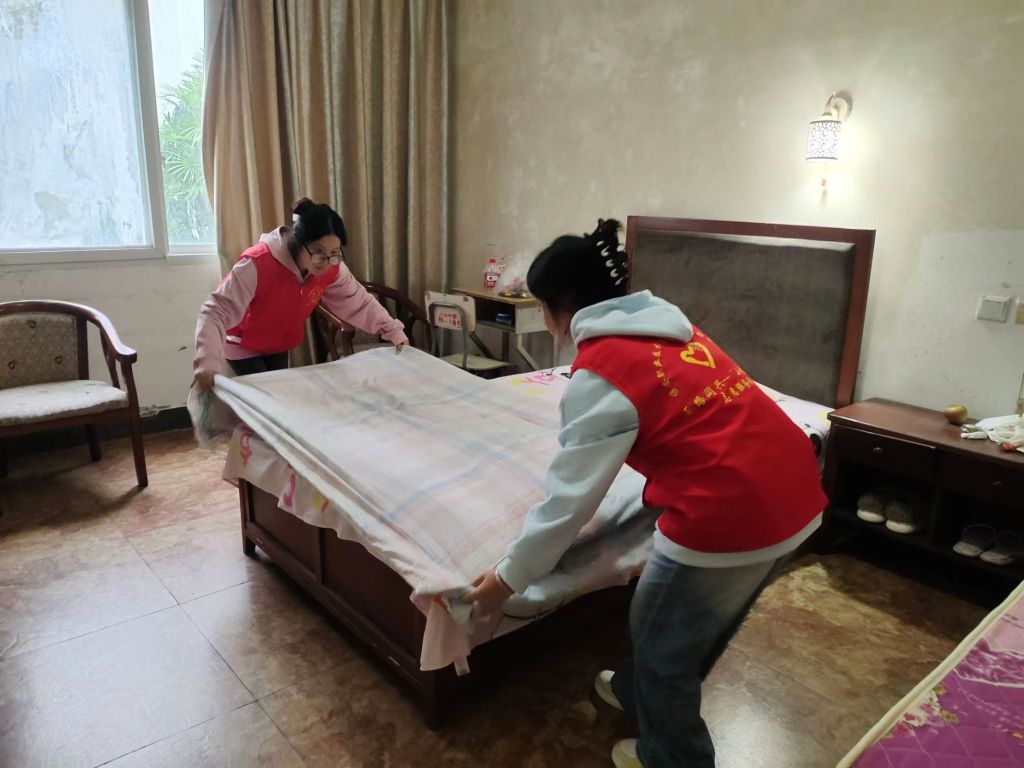 志愿者们提前到达养老院进行分工,一部分志愿者细心地为老人们整理床铺,确保老人们休息时的舒适与整洁。另一部分志愿者则拿起扫帚、抹布,认真打扫房间和院子,清除积尘与杂物,让敬老院焕然一新,充满了家的温馨。在院子里,作为医员工的大家给老人免费测血压,并根据其测量值给予相关的健康建议。除此之外,我们更注重精神上的慰藉。志愿者们有的围坐在老人身边,有的推着他们在院子里散步,倾听他们的故事,分享生活的点滴,用真诚的话语和温暖的笑容驱散他们内心的孤独与寂寞。看着老年人们那一张张布满皱纹却洋溢着幸福的笑脸,每一位志愿者心里都暖洋洋的。