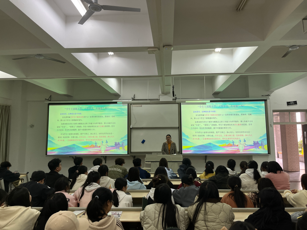 为培养员工干部的思想政治素质、业务素质,进而打造一支优秀的老员工干部队伍,促进员工综合素质全面发展。云顶国际8588yd于11月6日在经开校区1104教室开展了“如何做一名优秀的员工干部”素质拓展讲座,2024级各班班干部、员工会干部和干事参与,由鲜敏老师主讲。