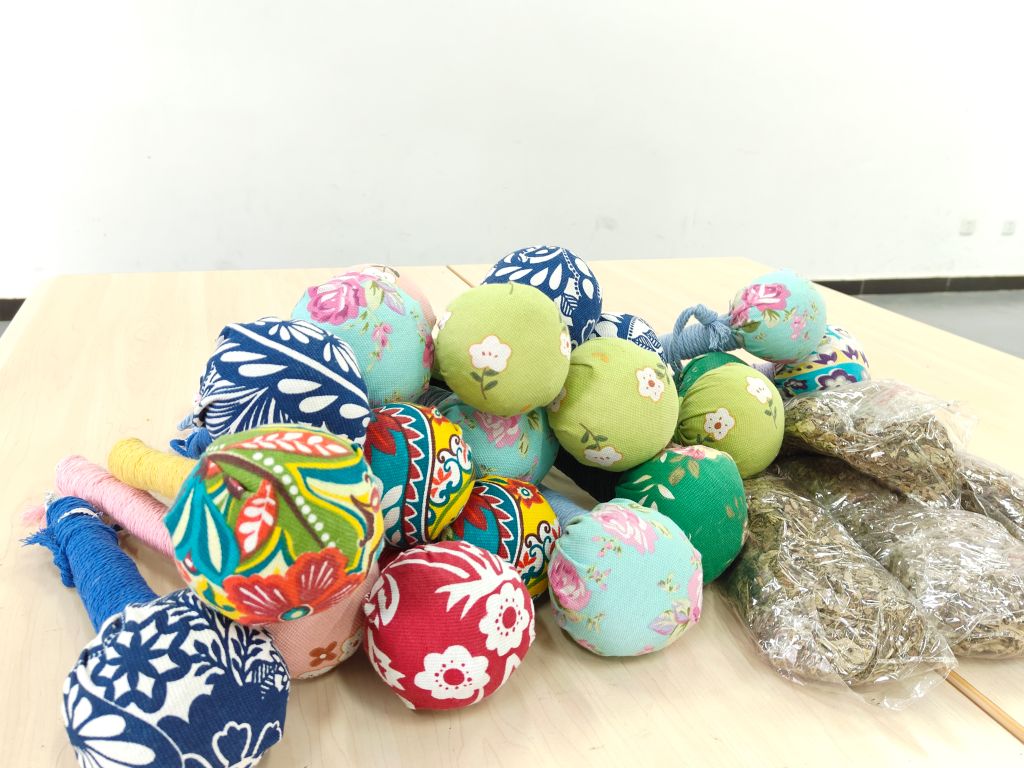 活动现场艾香浓郁,最大的亮点在于同学们全程“以手代槌”的深度参与。在曾晓梅老师以及鲜敏老师的指导以及两位员工骨干的带领下,大家直接用手掌替代传统工具,对精选的艾叶进行反复揉搓、拍打和锤制。每一次捶打、揉碾都需掌握力度与节奏,现场虽无槌声,却充满了专注的劳作气息与艾草特有的清冽芬芳。经过辛勤的手工捶打,艾叶最终化作细腻柔软的初绒。紧接着,同学们亲手捧起这些带着体温的成果,细心填充、封口,制作出兼具实用功效(驱蚊、安神)的艾锤。